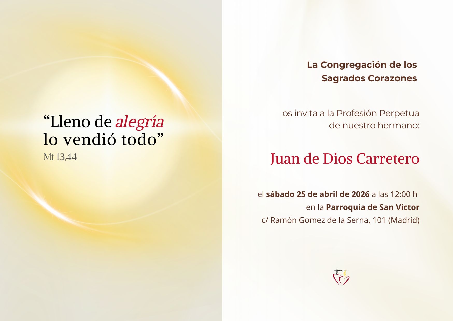La Congregación de los Sagrados Corazones os invita a la Profesión Religiosa Perpetua de Juan de Dios sscc
